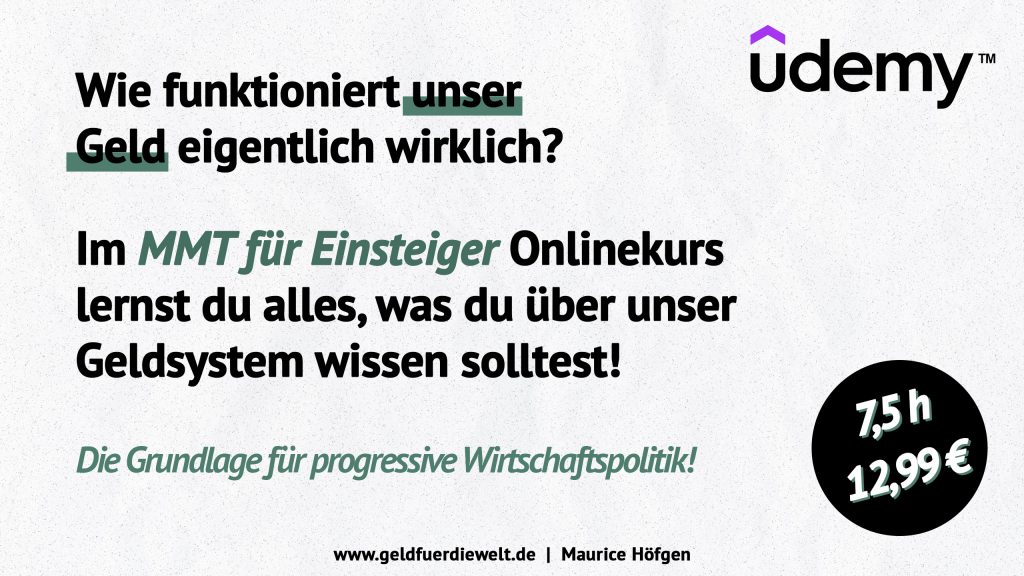 Auf der Lernplattform Udemy biete ich einen Online-Kurs zum Einstieg in die MMT an. 7 Stunden Videomaterial zur schrittweisen und leicht verständlichen Einführung in die Modern Monetary Theory!